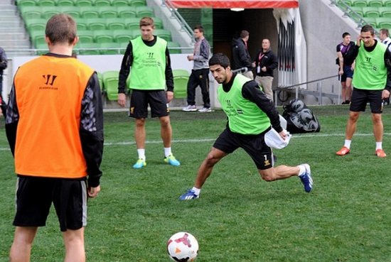 Stuck in the middle: Luis Suarez is training with Liverpool against after arriving in Australia on Saturday
